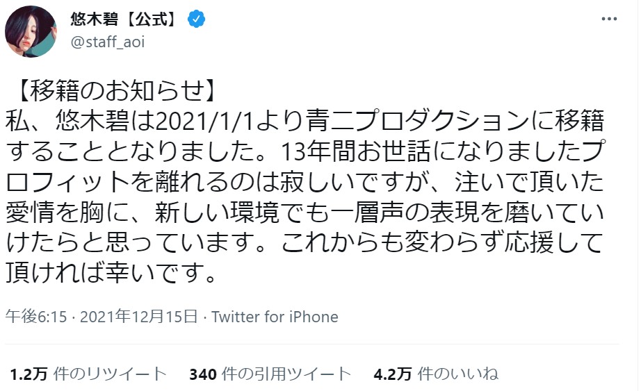 悠木碧さんは「私、悠木碧は2021/1/1より青二プロダクションに移籍することとなりました」「13年間お世話になりましたプロフィットを離れるのは寂しいですが、注いで頂いた愛情を胸に、新しい環境でも一層声の表現を磨いていけたらと思っています。これからも変わらず応援して頂ければ幸いです」とTwitterでコメント。