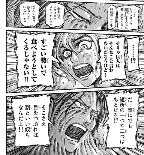 【進撃の巨人】短所がデカ過ぎる 2022/2/3 ねいろ速報さん " " 名前:ねいろ速報 【進撃の巨人】 諫山創 講談社 名前:ねいろ速報 2 マーレのことを言おうとしたんだろうけど無垢の巨人の話になってしまった 名前:ねいろ速報 3 マーレにしても生まれてこなければよかったのにって言いそうじゃないか? 続きを読む Source: ねいろ速報さん