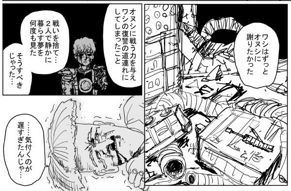 ワンパンマンで一番辛いシーン 2022/3/2 ねいろ速報さん " " 名前:ねいろ速報 【ワンパンマン】作者:ONE 名前:ねいろ速報 1 直前にみんなで楽しく晩御飯食べてたのに… 名前:ねいろ速報 3 >>1 疑似家族の団欒が容赦なくぶち壊される展開いいよね 続きを読む Source: ねいろ速報さん