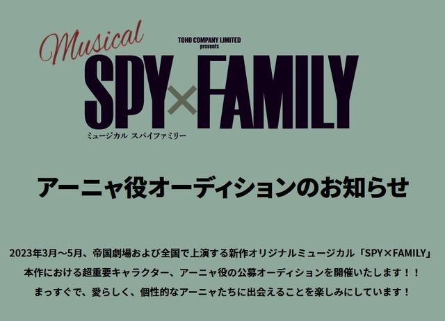 【スパイファミリー】アーニャ役はオーディションのお知らせ 2022/5/3 ねいろ速報さん " " 名前:ねいろ速報 スパイファミリーがミュージカルになるぞ アーニャ役はオーディション!年齢は問わない&性別に関しても特に記載が無かった 名前:ねいろ速報 1 舞台版じゃなくてミュージカル!? 名前:ねいろ速報 2 気は確かか? 続きを読む Source: ねいろ速報さん