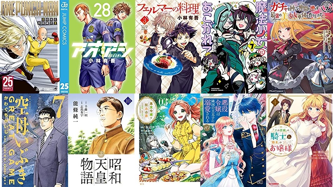 小学館からは「アオアシ 28巻」「空母いぶきGREAT GAME 7巻」「昭和天皇物語 10巻」「永世乙女の戦い方 7巻」「往生際の意味を知れ! 5巻」「お別れホスピタル 8巻」「忘却のサチコ 18巻」など、講談社「フェルマーの料理 3巻」「悪食令嬢と狂血公爵 3巻」など、KADOKAWA「悪役令嬢は隣国の王太子に溺愛される 10巻」「帰ってください! 阿久津さん 5巻」「夢で見たあの子のために 10巻」など、竹書房「魔法少女にあこがれて 7巻」など、マイクロマガジン社「ガチャを回して仲間を増やす 最強の美少女軍団を作り上げろ THE COMIC 7巻」など発売です。