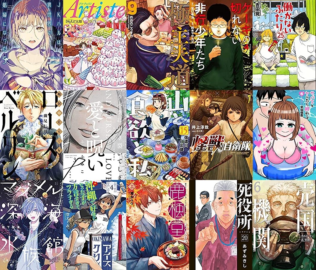「JKハルは異世界で娼婦になった」「Artiste(アルティスト)」「極主夫道」「ケーキの切れない非行少年たち」「働かないふたり」「傾国の仕立て屋 ローズ・ベルタン」「愛と呪い」「山と食欲と私」「怪獣自衛隊」「サバエとヤッたら終わる」「マグメル深海水族館」「沖縄で好きになった子が方言すぎてツラすぎる」「鹿楓堂よついろ日和」「死役所」「売国機関」「AV男優はじめました」「神と呼ばれたオタク」「でっちあげ」「少女終末旅行」「僕の妻は発達障害」「応天の門」「ガールクラッシュ」「見せたがりの露乃ちゃん」「ディノサン」「間違った子を魔法少女にしてしまった」などなど。