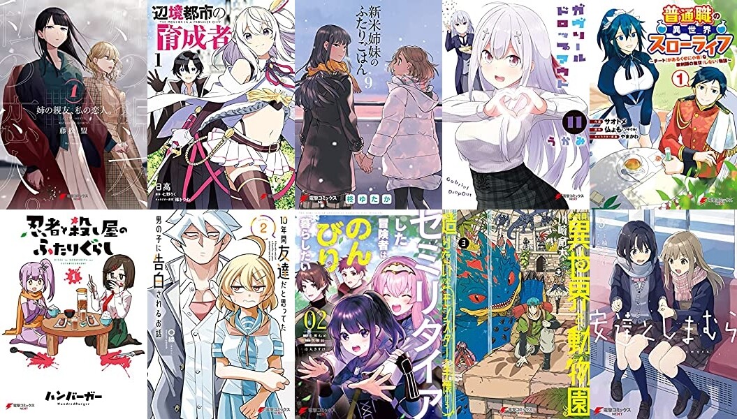セールとなっているのは、「姉の親友、私の恋人。」「辺境都市の育成者」「新米姉妹のふたりごはん」「ガヴリールドロップアウト」「普通職の異世界スローライフ」「忍者と殺し屋のふたりぐらし」「10年間友達だと思ってた男の子に告白されるお話」「セミリタイアした冒険者はのんびり暮らしたい」などなど。