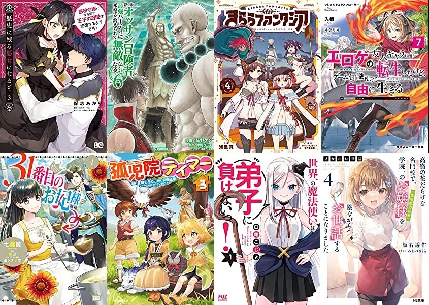 マンガではKADOKAWA「歴史に残る悪女になるぞ 悪役令嬢になるほど王子の溺愛は加速するようです! 3巻」「31番目のお妃様 4巻」「狼領主のお嬢様 5巻」「駄犬に注意! 4巻」など、ホビージャパン「新米オッサン冒険者、最強パーティに死ぬほど鍛えられて無敵になる。6巻」「孤児院テイマー 3巻」「いっつも塩対応な幼なじみだけど、俺に片想いしているのがバレバレでかわいい。1巻」「魔王使いの最強支配 1巻」など、芳文社「きららファンタジア 4巻」「世界一の魔法使いは弟子に負けないっ! 1巻」などが発売。