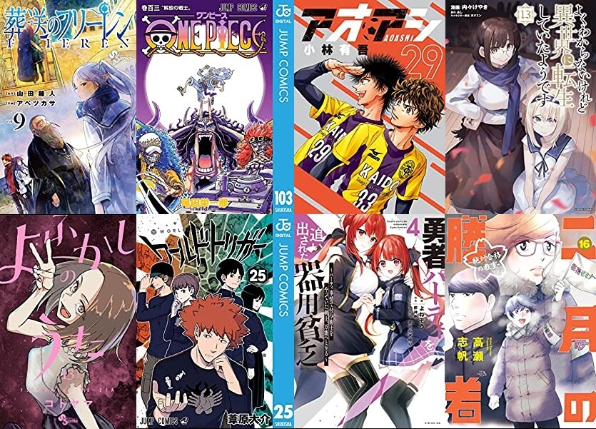 対象には、なんと9月15日発売「葬送のフリーレン」「よふかしのうた」など小学館 少年サンデーコミックス。さらに9月16日新刊発売「シャングリラ・フロンティア」「彼女、お借りします」など講談社 少年マガジンコミックス、「キングダム」「少年のアビス」など集英社 ヤングジャンプコミックスも入っています。予約中のものはまとめ買いに追加できないので、発売日まで待って買うのがいいかなと思います。