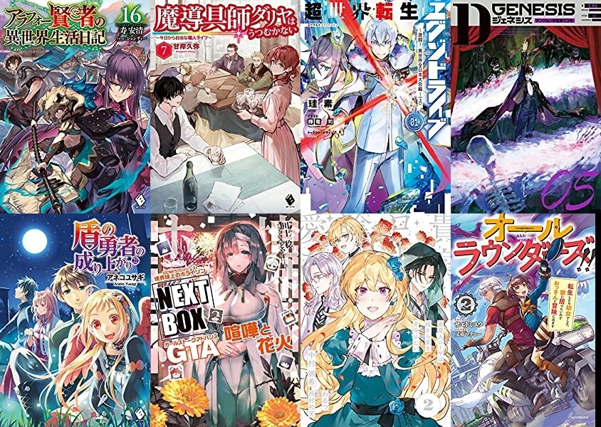 ライトノベルは1000冊以上が対象。「アラフォー賢者の異世界生活日記」「魔導具師ダリヤはうつむかない」「超世界転生エグゾドライブ」「Dジェネシス」「盾の勇者の成り上がり」「GENESISシリーズ 境界線上のホライゾン NEXT BOX「貴腐人ローザは陰から愛を見守りたい」などなど。