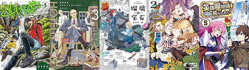 KADOKAWAより「山を渡る 5巻」「ホテル・メッツァペウラへようこそ 3巻」などHARTA COMIX、「欠けた月のメルセデス 2巻」「英雄魔術師はのんびり暮らしたい 5巻」などTOブックスのコロナ・コミックスなどが発売です。