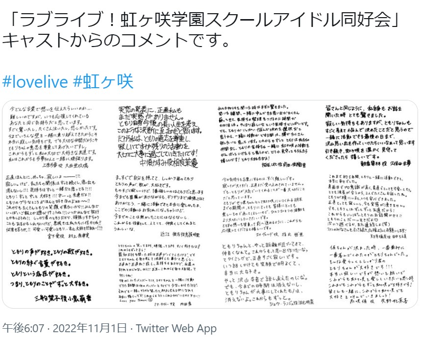 また、病名が確定したことを受け、「ラブライブ!虹ヶ咲学園スクールアイドル同好会」公式サイトでは、ライブ活動が困難を判断されたと報告があり、それに伴い交番の申し出を受けたとのこと。そして「製作委員会内で慎重に協議を重ねた結果、本人の病状をふまえ、この申し出を受け入れることといたしました」とのことです。