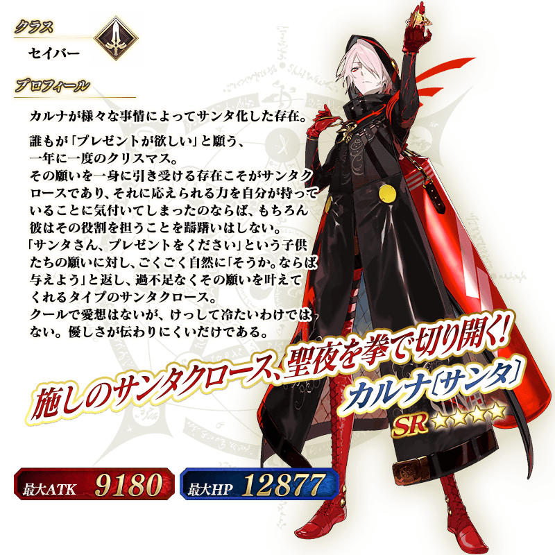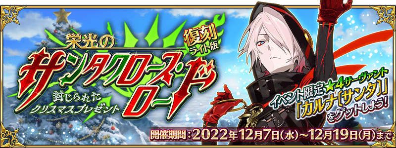 「特異点F 炎上汚染都市 冬木」をクリアしたマスターが対象で、様々なアイテムがもらえる抽選が可能。またイベント限定サーヴァント「★4(SR)カルナ〔サンタ〕」が登場します。
