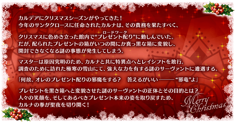 過去に開催されたクリスマスイベントの復刻版。今年もクリスマスシーズンが到来したカルデア。しかし、館内では配られたプレゼントの箱がいつの間にか真っ黒な箱に変貌し開封できなくなってしまう謎の現象が発生。