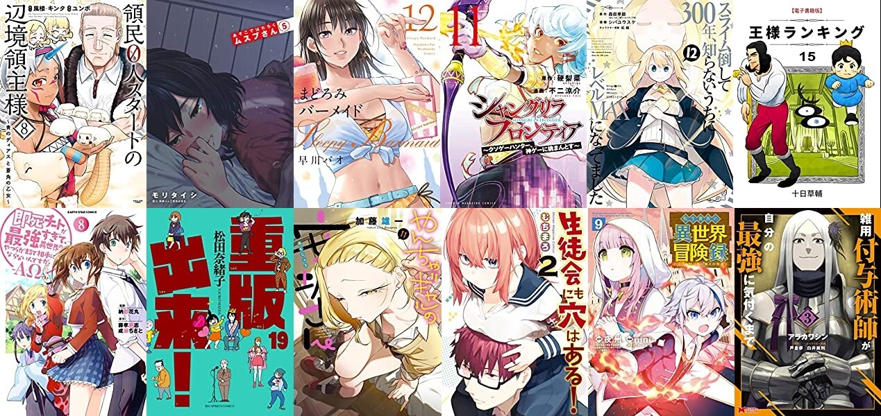 アース・スター「領民0人スタートの辺境領主様 8巻」「即死チートが最強すぎて、異世界のやつらがまるで相手にならないんですが。-ΑΩ- 8巻」「願いを叶えてもらおうと悪魔を召喚したけど、可愛かったので結婚しました 5巻」など、小学館「よふかしのうた 14巻」「あそこではたらくムスブさん 5巻」「重版出来! 19巻」「日本三國 3巻」「トニカクカワイイ 22巻」「マロニエ王国の七人の騎士 7巻」「灼熱カバディ 23巻」など発売。