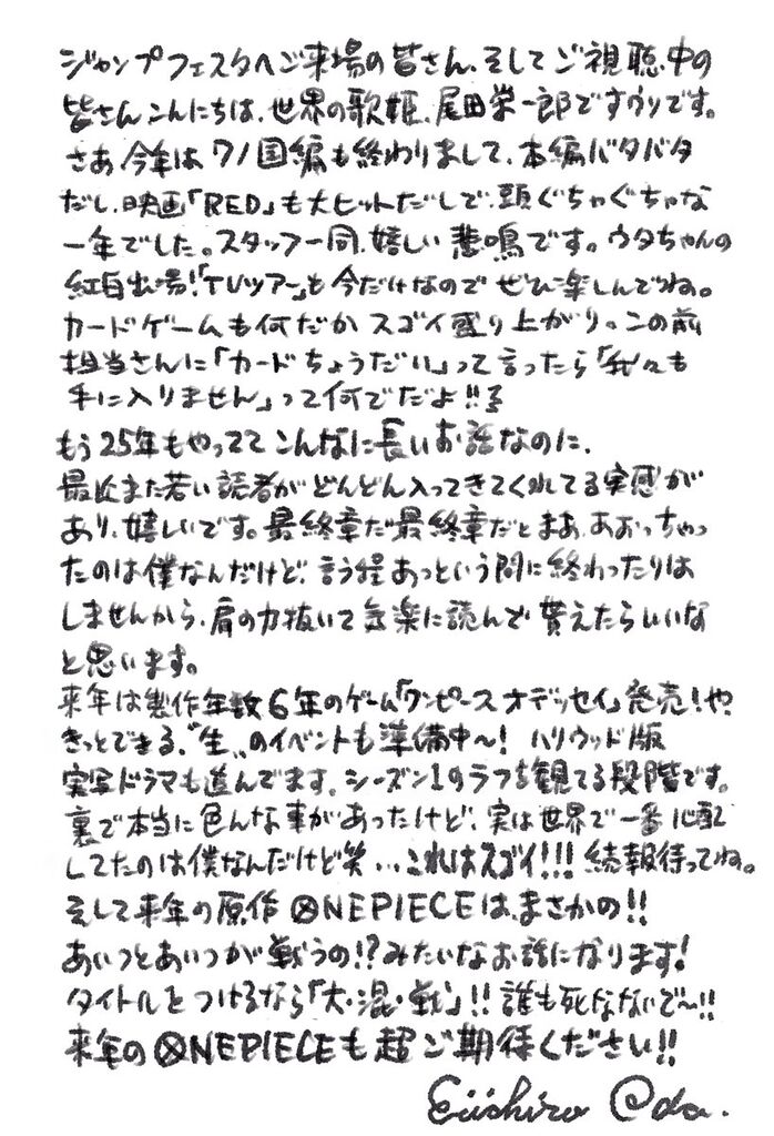 さらに「来年の原作『ONE PIECE』は、まさかの!! あいつとあいつが戦うの!?みたいなお話になります! タイトルをつけるな『ONE PIECE』ら『大・混・戦』!! 誰も死なないで~!! 来年の『ONE PIECE』も超ご期待ください!!」と呼びかけた。