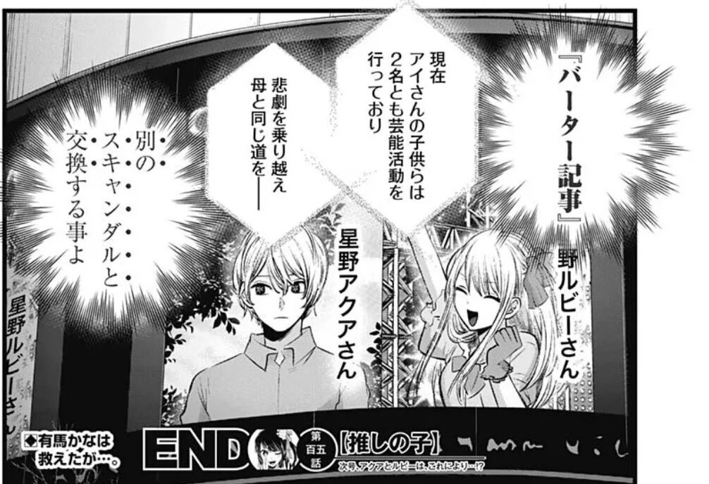 【推しの子 105話感想】アクア、とんでもないスキャンダルを週刊誌にリークしてしまう!! 2023/1/19 最強ジャンプ放送局 " " 1: 2023/01/19(木) そうきたか そりゃアイドルの泊まり未遂よりでかいわ 出典:推しの子105話 赤坂アカ・横槍メンゴ 集英社 3: 2023/01/19(木) いずれ世間にばれる事ではあったんだけどこう出して来たか ばれてないと15年目の嘘って映画が作られない 2: 2023/01/19(木) うっわエグいなー 説得力は確かにあるけど、この先どうすんだ 4: 2023/01/19(木) やりやがった… 予想はしてたけどやってほしくなかった… 続きを読む Source: 最強ジャンプ放送局