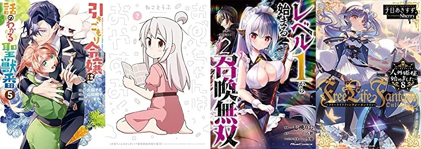 マンガでは一迅社「引きこもり令嬢は話のわかる聖獣番: 5」「お兄ちゃんはおしまい!7巻 特装版小冊子電子版」「男運ゼロの薬師令嬢、初恋の黒騎士様が押しかけ婚約者になりまして。: 3」「昨今のシンデレラは靴を落とさない。 小冊子付き電子特装版: 3」など、マイクロマガジン社「レベル1から始まる召喚無双 THE COMIC 2」「突然パパになった最強ドラゴンの子育て日記~かわいい娘、ほのぼのと人間界最強に育つ~ THE COMIC 4」など発売。