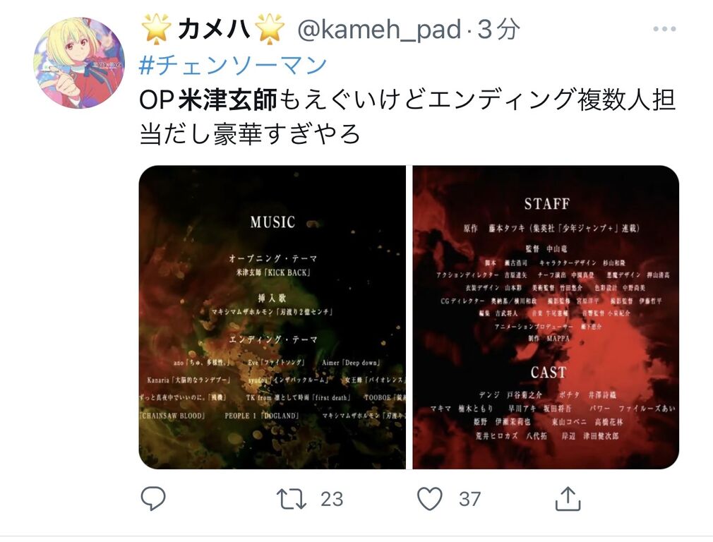 【画像】『新アニメ』チェンソーマン、エンディングテーマに力を入れすぎてると話題にwwwwww 2023/2/4 ジャンプ速報 " " 1: それでも動く名無し 2023/02/04(土) 14:29:45.69 ID:TvgNknbWM うおおお 続きを読む Source: ジャンプ速報