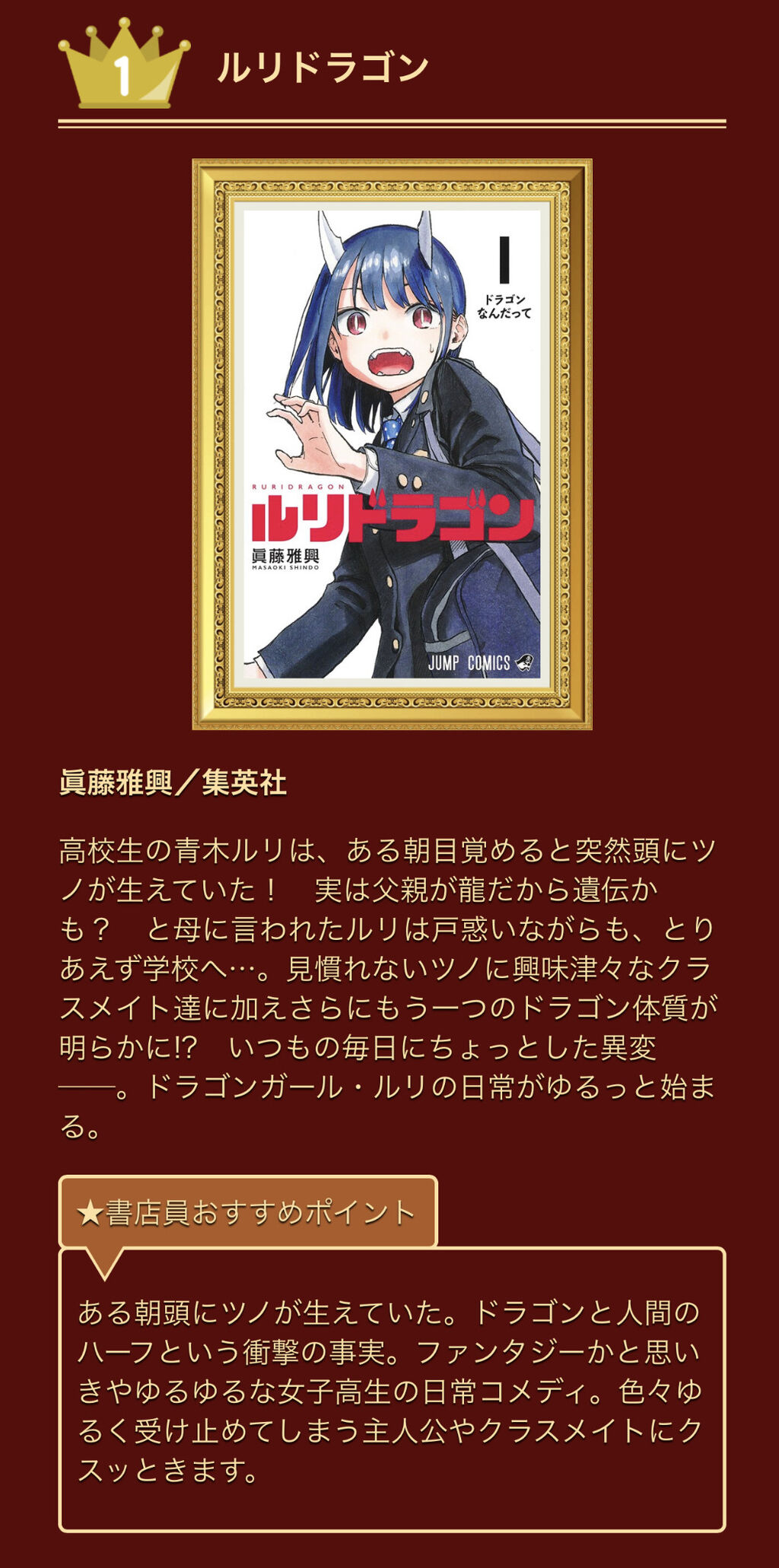 『全国書店員が選んだおすすめコミック2023』(日販調べ)が2日に発表され、眞藤雅興(しんどう・まさおき)さんの『ルリドラゴン』が1位に輝きました。