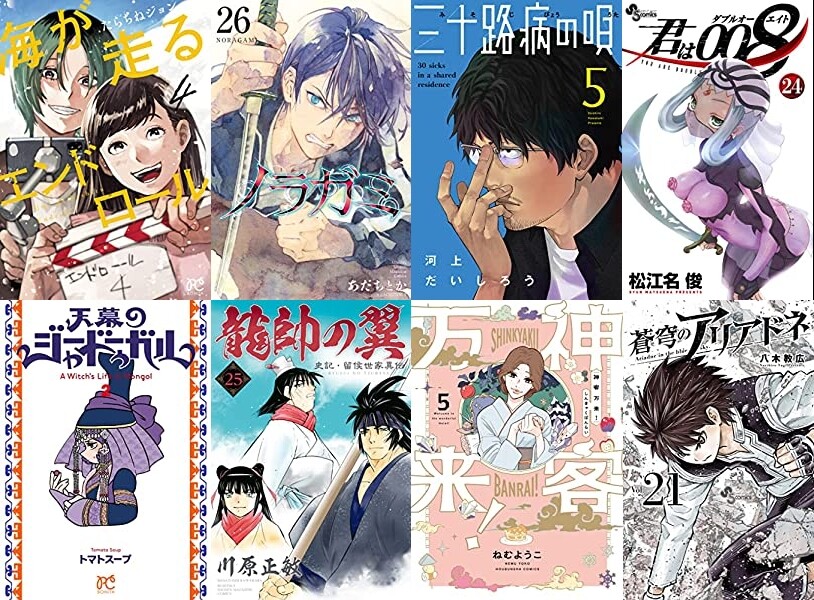 秋田書店より「海が走るエンドロール 4」「天幕のジャードゥーガル 2」「ちひろさん 未収録作品パック」「酒処 春來荘日乗 2」など、講談社「ノラガミ(26)」「龍帥の翼 史記・留侯世家異伝(25)」「陸奥圓明流異界伝 修羅の紋 ムツさんはチョー強い?!(6)」「くろアゲハ~カメレオン外伝~(20)」「君じゃなきゃダメな奴隷少女(4)」「ピーチボーイリバーサイド(13)」など発売。