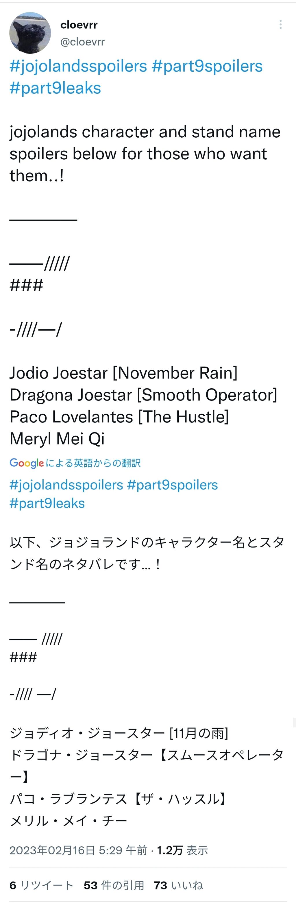 【話題】ジョジョ9部主人公はジョディオ・ジョースター、スタンドは11月の雨 2023/2/18 ジャンプ速報 " " 1: ちーん 2023/02/16(木) 07:58:20.77 ID:/5iGEJwTd 続きを読む Source: ジャンプ速報