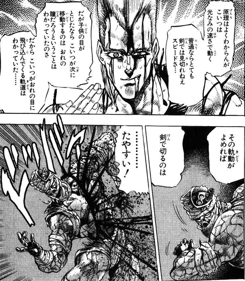 【ジョジョ】ポルナレフ「軌道がよめれば剣で切るのはたやすい」 2023/2/19 ねいろ速報さん " " 名前:ねいろ速報 このシーンポルナレフの言ってることどこ見てもさっぱりわかんないんだけどどういうこと? 【ジョジョの奇妙な冒険】荒木飛呂彦 集英社 名前:ねいろ速報 1 軌道とタイミングがわかってればそこに剣を置いておけばいいだけの話 名前:ねいろ速報 2 子供の目をA点としてポルナレフの目をB点とする A点からB点に移動する際凄い速度で移動はするが軌道は予め把握できている その軌道に沿って剣を振るえば 続きを読む Source: ねいろ速報さん