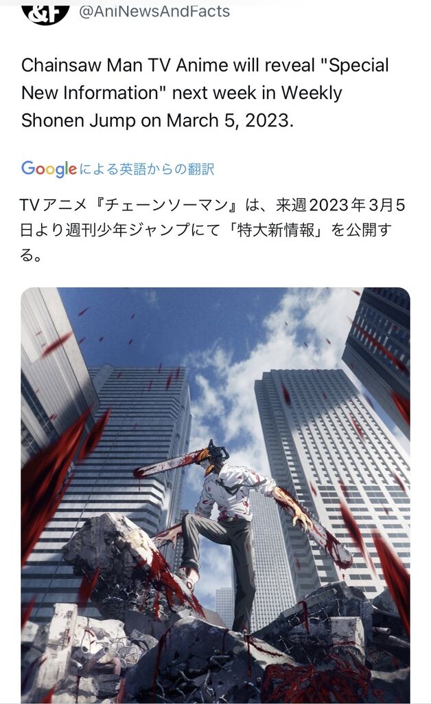 【え?】リーク垢『チェンソーマンは3月5日に重大発表します』←これ 2023/3/8 ジャンプ速報 " " 1: それでも動く名無し 2023/03/04(土) 14:21:49.28 ID:l1w1nlJR0 令和最大の黒歴史が生まれる模様… 続きを読む Source: ジャンプ速報
