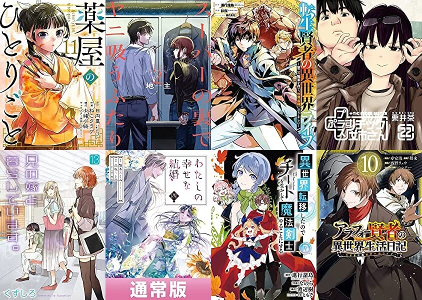 セール対象となるのは、2023年2月以前に発売されたマンガ・巻。アニメ化決定の推理作品「薬屋のひとりごと」や、荒川弘さん最新作「黄泉のツガイ」などが最新巻までセール!ほか、「スーパーの裏でヤニ吸うふたり」「転生賢者の異世界ライフ」「プラスチック姉さん」「わたしの幸せな結婚」「兄の嫁と暮らしています。」「異世界転移したのでチートを生かして魔法剣士やることにする」などもセールです。