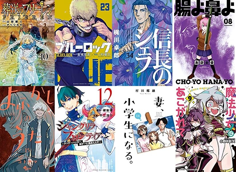 小学館より少年サンデーコミックスなど「葬送のフリーレン(10)」「よふかしのうた(15)」「トニカクカワイイ(23)」「魔王城でおやすみ(24)」「帝乃三姉妹は案外、チョロい。(5)」、講談社より週刊少年マガジンコミックス「ブルーロック(23)」「シャングリラ・フロンティア(12)」「化物語(21)」「それでも歩は寄せてくる(14)」「はじめの一歩(137) 」「カッコウの許嫁(16)」「江戸前エルフ(7)」「DYS CASCADE(3)」「黙示録の四騎士(11)」「オフ会したらとんでもないやつが来た話(3)」など発売。