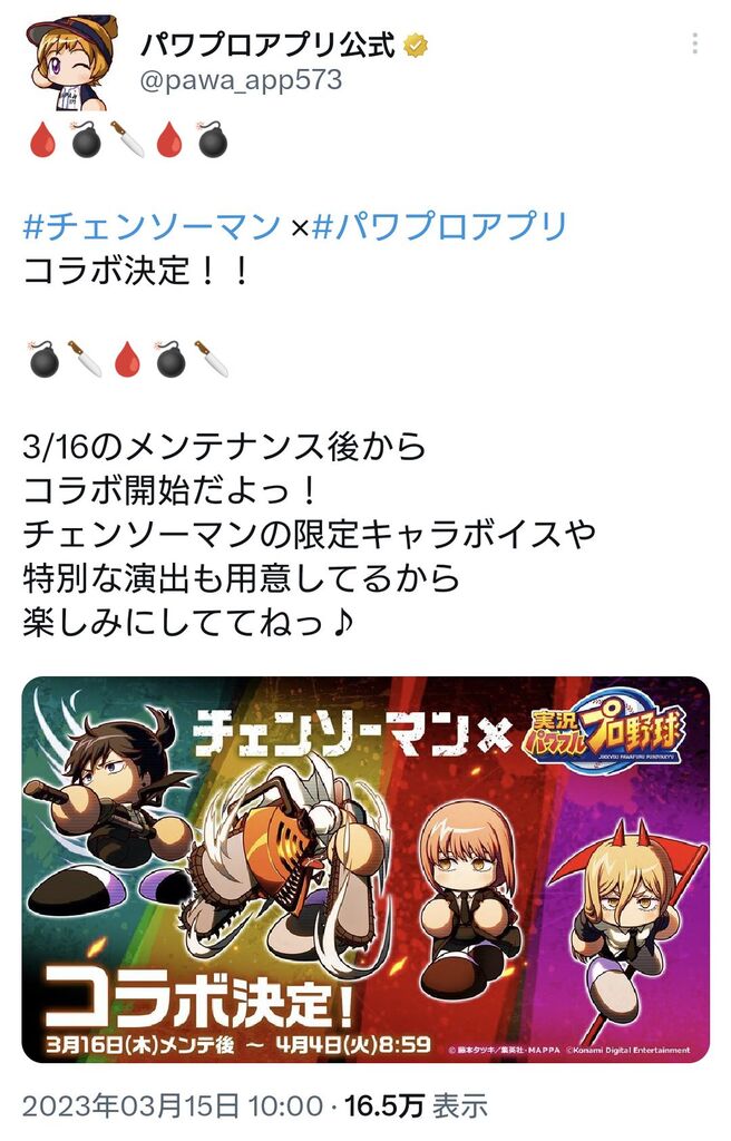 パワプロとチェンソーマン、コラボするWWWWWWWWWWWWWWWWWWWWWWWW【チェンソーマン】 2023/3/18 ジャンプ速報 " " 1: 風吹けば名無し 2023/03/15(水) 13:58:50.83 ID:clzL4uYPa 続きを読む Source: ジャンプ速報