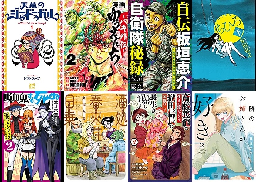 2023年2月までに発売された作品が対象となっているみたいです。モンゴル帝国を舞台に描かれる話題作「天幕のジャードゥーガル」、バキ外伝「漫画 ゆうえんち」、ほか「ちひろ」「自伝板垣恵介自衛隊秘録~我が青春の習志野第一空挺団~」「酒処 春來荘日乗」「斎藤義龍に生まれ変わったので、織田信長に国譲りして長生きするのを目指します!」「隣のお姉さんが好き 」など対象です。