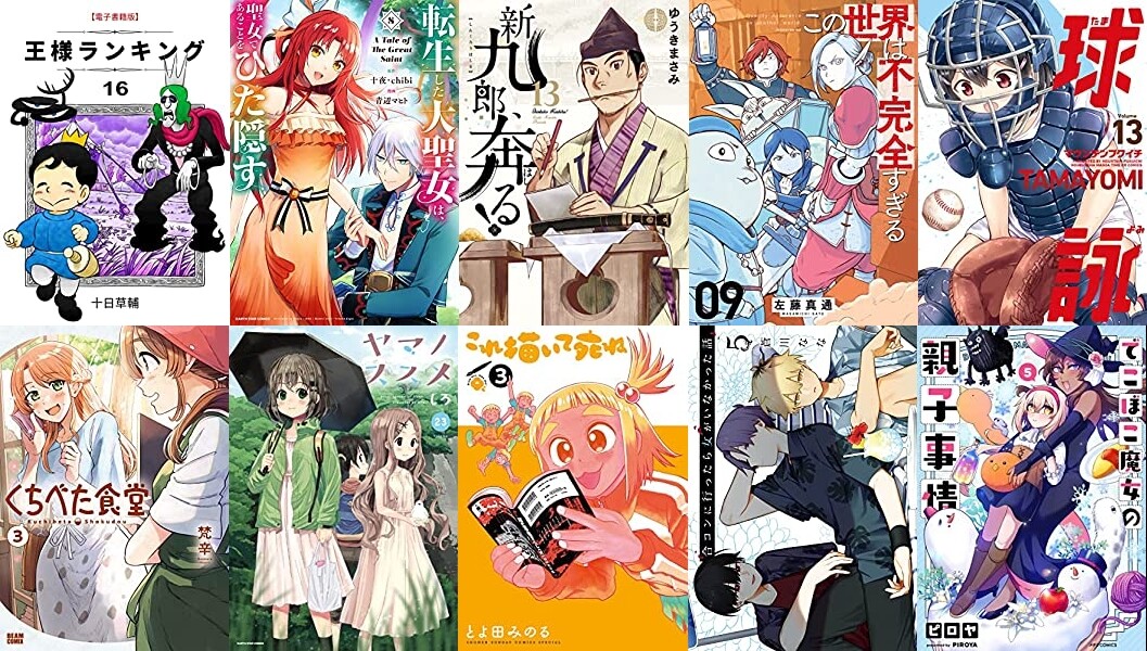 ブリック出版よりアニメ化がされた「王様ランキング(16)」、アース・スター「転生した大聖女は、聖女であることをひた隠す A Tale of The Great Saint 8」「ヤマノススメ 23」「メイドなら当然です。 ~万能メイド、濡れ衣かぶって旅に出る。~ 1」など発売。