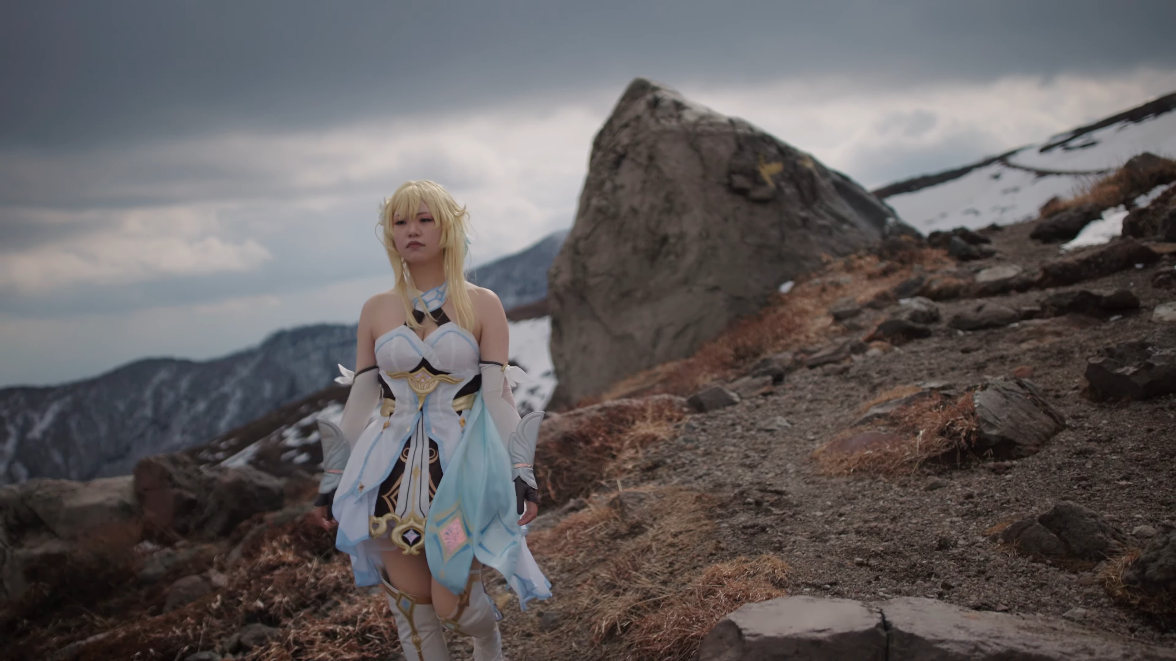 撮影したキャラクターは、「原神」蛍、タルタリヤ、甘雨の3名。ゲームにある広大なステージに近い場所で撮影がしたく、標高1900mほどの山へロープウェイで向かい、強風の中、寒さと戦いながら撮影させていただきました。