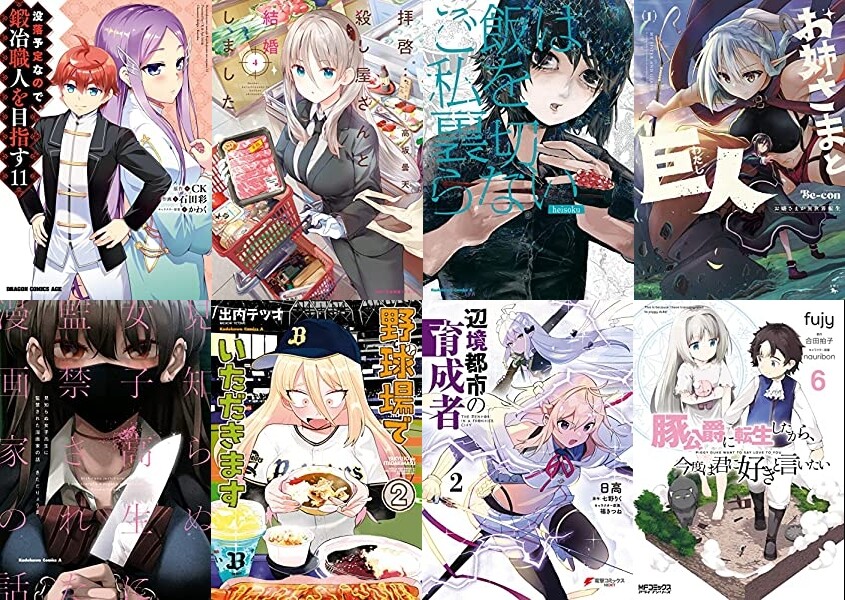 「没落予定なので、鍛冶職人を目指す」「拝啓…殺し屋さんと結婚しました」「ご飯は私を裏切らない」「お姉さまと巨人 お嬢さまが異世界転生」「見知らぬ女子高生に監禁された漫画家の話」「野球場でいただきます」「辺境都市の育成者」「ぐだぐだエース RE」「准教授・高槻彰良の推察」「豚公爵に転生したから、今度は君に好きと言いたい」「夢で見たあの子のために」などなど。