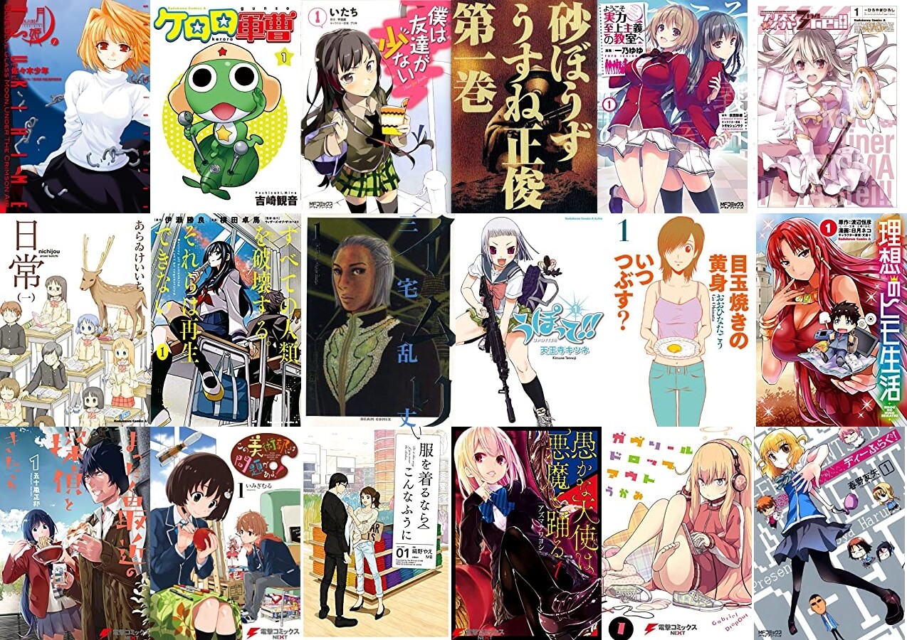 「真月譚 月姫」「ようこそ実力至上主義の教室へ」「ケロロ軍曹」「D・N・ANGEL」「Fate/kaleid liner プリズマ☆イリヤ ドライ!!」「僕は友達が少ない」「黒鷺死体宅配便」「砂ぼうず」「すべての人類を破壊する。それらは再生できない。」「イムリ」「うぽって!!」「目玉焼きの黄身 いつつぶす?」「異世界居酒屋『のぶ』」「理想のヒモ生活」「まったく最近の探偵ときたら」「この美術部には問題がある!」「服を着るならこんなふうに」「愚かな天使は悪魔と踊る」「ガヴリールドロップアウト」「はたらく魔王さま!」…などなど。
