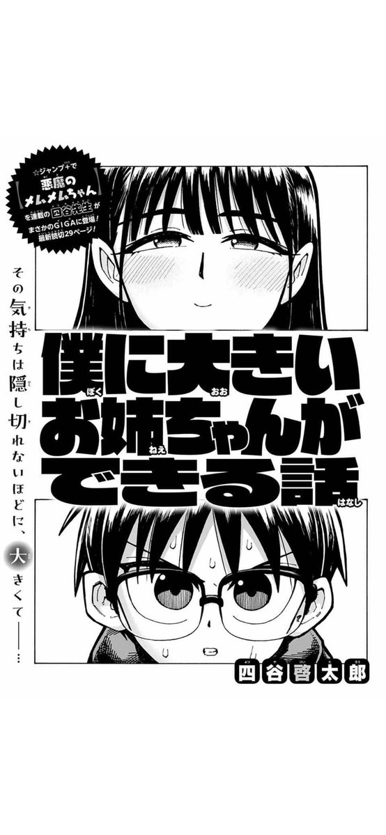 今日発売のジャンプGIGAという雑誌に新作読み切りが載ってます!よかったら読んでみてください!タイトルは「僕に大きいお姉ちゃんができる話」です。