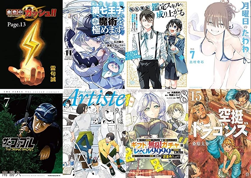 5月発売のマンガも対象となっています。「金色のガッシュ!! 2」「ザ・ファブル The second contact」「キングダム」「転生したら第七王子だったので、気ままに魔術を極めます」「Artiste(アルティスト)」「転生貴族、鑑定スキルで成り上がる」「信じていた仲間達にダンジョン奥地で殺されかけたがギフト『無限ガチャ』でレベル9999の仲間達を手に入れて元パーティーメンバーと世界に復讐&『ざまぁ!』します!」「月曜日のたわわ」「うるわしの宵の月」「空挺ドラゴンズ」「舞妓さんちのまかないさん」「アンダーニンジャ」などなど。