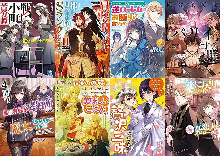 「戦国小町苦労譚」「冒険者になりたいと都に出て行った娘がSランクになってた」「転生前は男だったので逆ハーレムはお断りしております」「俺は全てを【パリイ】する」「異世界転移して教師になったが、魔女と恐れられている件」「転生したら最愛の家族にもう一度出会えました」「こんな異世界のすみっこで」「悪役姫は今日も迷宮に潜る」「贅沢三昧したいのです!転生したのに貧乏なんて許せないので、魔法で領地改革」「死に戻りの魔法学校生活を、元恋人とプロローグから(※ただし好感度はゼロ)」「町人Aは悪役令嬢をどうしても救いたい」などなど。