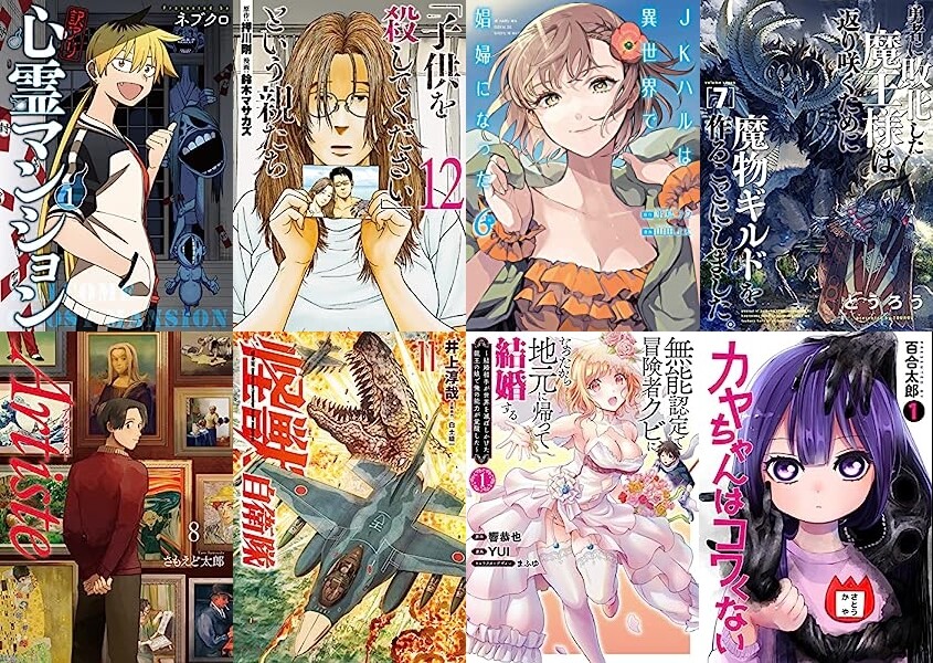 6月17日21時の時点で、1000冊近くがセールとなっています。「訳アリ心霊マンション」「Artiste(アルティスト)」「『子供を殺してください』という親たち」「怪獣自衛隊」「JKハルは異世界で娼婦になった」「無能認定で冒険者クビになったから地元に帰って結婚する」「勇者に敗北した魔王様は返り咲くために魔物ギルドを作ることにしました。」「カヤちゃんはコワくない」などなど。