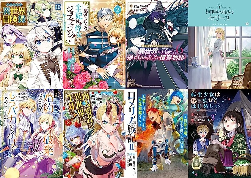 アニメ化がされた「転生貴族の異世界冒険録」のほか、「裏切られたので、王妃付き侍女にジョブチェンジ!」「ガベージブレイブ」「河畔の街のセリーヌ」「王太子に婚約破棄されたので、もうバカのふりはやめようと思います」「転生した悪役令嬢は復讐を望まない」「特級探索師への覚醒」「世界の果てにも風は吹く」「商人勇者は異世界を牛耳る!」「悪役令嬢に転生したと思ったら、シンデレラの義姉でした」「ロメリア戦記」「異世界転生の冒険者」「ふることふひと」「転生少女はまず一歩からはじめたい」などなど。