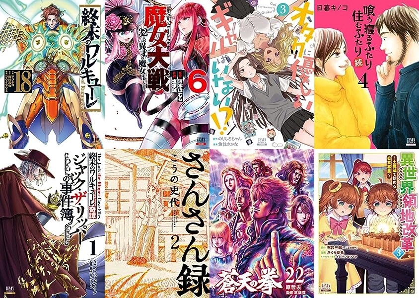 アニメ化もされた神VS人類「終末のワルキューレ」に、魔女バトルマンガ「魔女大戦 32人の異才の魔女は殺し合う」、スクールカーストラブコメ「オタクに優しいギャルはいない!?」、ほか「喰う寝るふたり 住むふたり 続」「さんさん録」「蒼天の拳」「異世界領地改革~土魔法で始める公共事業~」「いくさの子 ‐織田三郎信長伝‐ 」「モブ子の恋」「トレース 科捜研法医研究員の追想」「うちのちいさな女中さん」「19番目のカルテ 徳重晃の問診」など対象です。