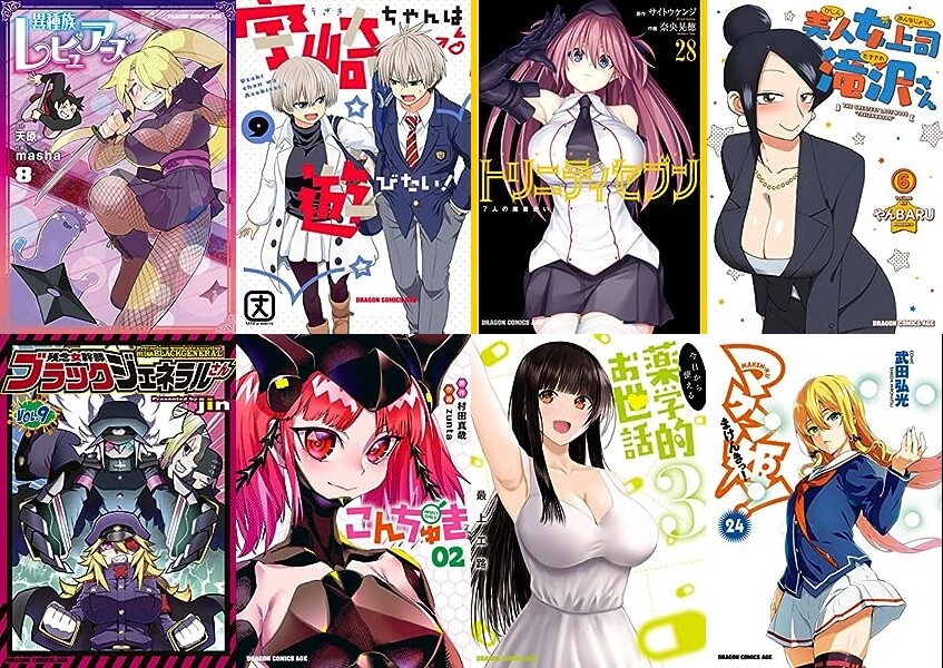 「異種族レビュアーズ」「宇崎ちゃんは遊びたい!」「世界を救うために亜人と朝チュンできますか?」「トリニティセブン」「美人女上司滝沢さん」「残念女幹部ブラックジェネラルさん」「こんちゅき」「今日から使える薬学的お世話」「マケン姫っ!」など対象です。