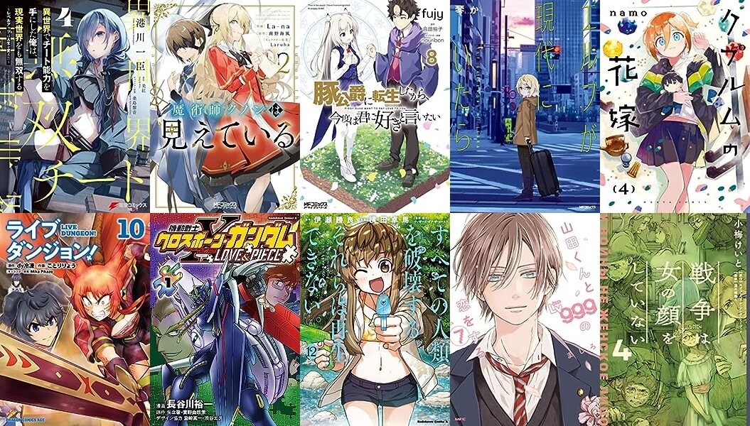 「異世界でチート能力を手にした俺は、現実世界をも無双する」「魔術師クノンは見えている」「豚公爵に転生したから、今度は君に好きと言いたい」「エルフが現代にいたら」「クプルムの花嫁」「ライブダンジョン!」「機動戦士クロスボーン・ガンダム LOVE&PIECE」「すべての人類を破壊する。それらは再生できない。」「山田くんとLv999の恋をする」「戦争は女の顔をしていない」「残念女幹部ブラックジェネラルさん」「安達としまむら」など、50冊ほどまとめました。