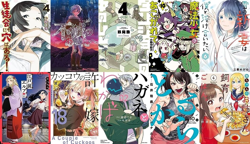 そして双葉社「ダンジョンの中のひと : 4」「ハガネとわかば : 2」など、竹書房「魔法少女にあこがれて (10)」「雪の新妻は僕と溶け合いたい (6)」「どるから (10)」「サキュバス学園の犬ッ!! (6)」「お姉さんは女子小学生に興味があります。(10)」「舞ちゃんのお姉さん飼育ごはん。 (4)」など発売です。