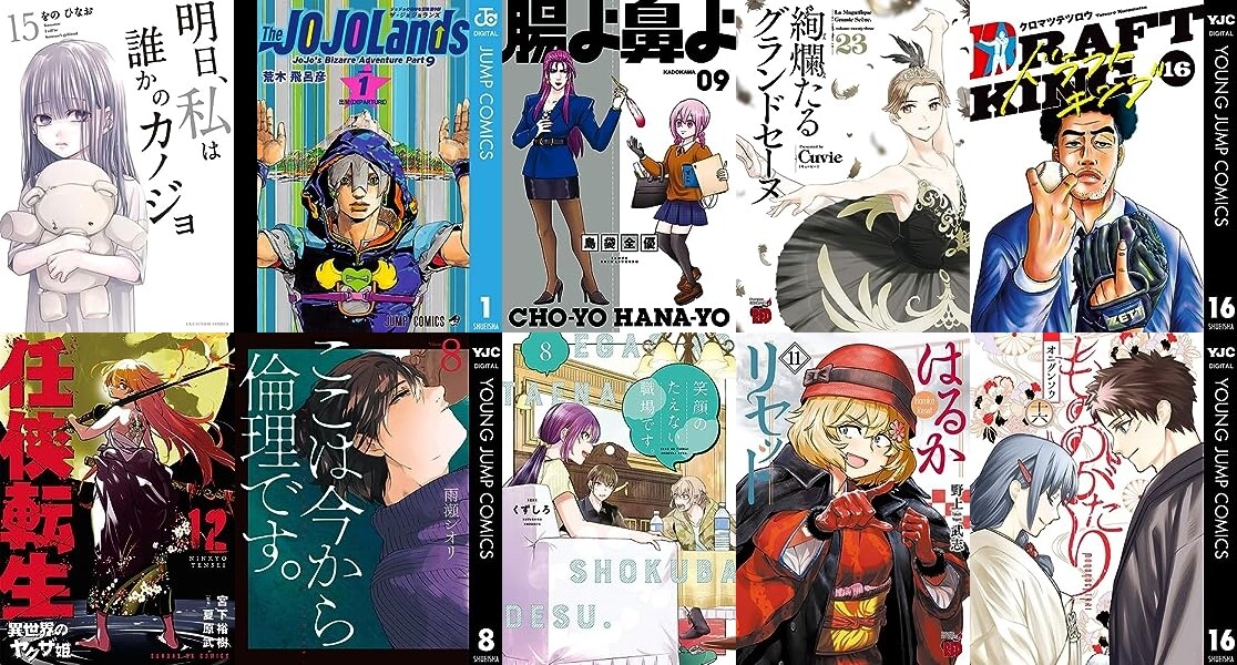 そして集英社「ジョジョの奇妙な冒険 第9部 ザ・ジョジョランズ 1」「ここは今から倫理です。 8」「ドラフトキング 16」「もののがたり 16」「銀河英雄伝説 27」「ジャンケットバンク 12」「新しいきみへ 5」「復讐を希う最強勇者は、闇の力で殲滅無双する 10」「BUNGO―ブンゴ― 36」「ヤンキー君と科学ごはん 2」「転生ゴブリンだけど質問ある? 8」「バツハレ 4」「王立魔法学園の最下生~貧困街上がりの最強魔法師、貴族だらけの学園で無双する~ 10」「くじ引き特賞:無双ハーレム権 9」「王様の仕立て屋~下町テーラー~ 16」「サベージファングお嬢様 3」「GIGANTIS―ジャイガンティス― 5」「失業賢者の成り上がり 12」「つれないほど青くて あざといくらいに赤い 4」「異世界に来た僕は器用貧乏で素早さ頼りな旅をする 8」「DINER ダイナー 19」「【推しの子】1stイラスト集 Glare×Sparkle」などたくさん発売。
