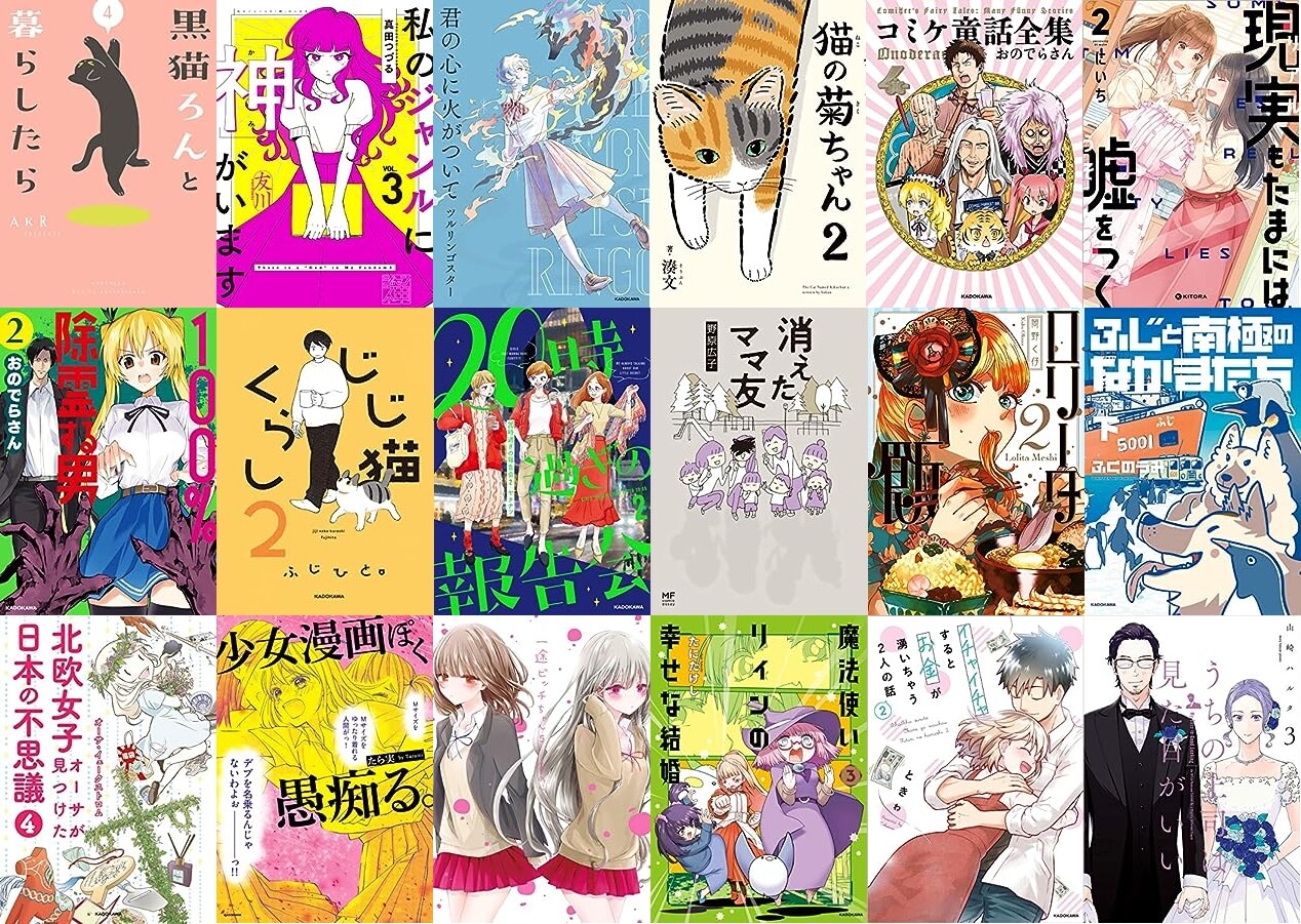 KADOKAWAのコミックエッセイ及び中経☆コミックス作品の多くが、大体50%OFFとなっています。「黒猫ろんと暮らしたら」「私のジャンルに『神』がいます」「君の心に火がついて」「猫の菊ちゃん」「コミケ童話全集」「現実もたまには嘘をつく」「100%除霊する男」「じじ猫くらし」「20時過ぎの報告会」「あたしゃ川尻こだまだよ」「消えたママ友」「ロリータ飯」「ふじと南極のなかまたち」などがセールです。
