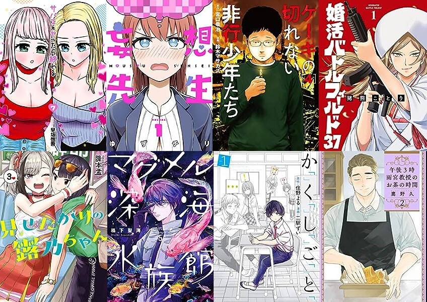 「サバエとヤッたら終わる」「妄想先生」「見せたがりの露乃ちゃん」「ケーキの切れない非行少年たち」「婚活バトルフィールド37」「マグメル深海水族館」などが複数巻セールとなっています。