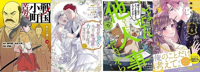 アース・スター「戦国小町苦労譚 眠れる獅子 14」「無自覚聖女は今日も無意識に力を垂れ流す ~公爵家の落ちこぼれ令嬢、嫁ぎ先で幸せを掴み取る~ 3」「贅沢三昧したいのです!~貧乏領地の魔法改革 悪役令嬢なんてなりません!~ 3」、白泉社「しょせん他人事ですから ~とある弁護士の本音の仕事~ 5」など、講談社「恋ヶ窪くんにはじめてを奪われました(6)」「お嬢と番犬くん(9)」「ダーウィンクラブ(6)」「むせるくらいの愛をあげる(2)」など、徳間書店「誰何Suika(3)」「生まれ変わるなら犬がいい(1)」など、コアミックス「北斗の拳外伝 天才アミバの異世界覇王伝説 5巻」など発売です。