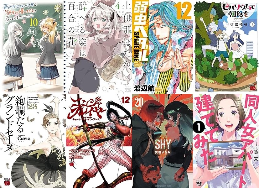 「声がだせない少女は『彼女が優しすぎる』と思っている」「上伊那ぼたん、酔へる姿は百合の花」「弱虫ペダル SPARE BIKE」「SHY」「絢爛たるグランドセーヌ」「魔界の主役は我々だ!」「ニンジャスレイヤー・キョート・ヘル・オン・アース」「十三歳の誕生日、皇后になりました。」「」「BEASTARS」などなど。