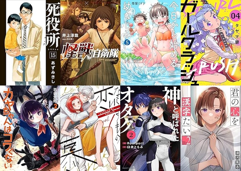 連載10周年となる「死役所」のほか、「怪獣自衛隊」「今日から始める幼なじみ」「ガールクラッシュ」「カヤちゃんはコワくない」「ならずもの恋慕」「神と呼ばれたオタク」「君の心を漢字たい」「サイバーパンク桃太郎」がセールです。