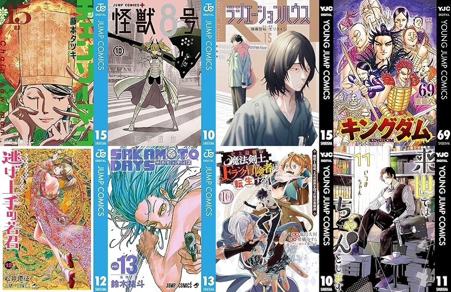 「チェンソーマン」「怪獣8号」「ラジエーションハウス」「来世ではちゃんとします」「キングダム」「逃げ上手の若君」「株式会社マジルミエ」「SAKAMOTO DAYS」「呪術廻戦 0 東京都立呪術高等専門学校」「史上最強の魔法剣士、Fランク冒険者に転生する」「放課後ひみつクラブ」などなど。
