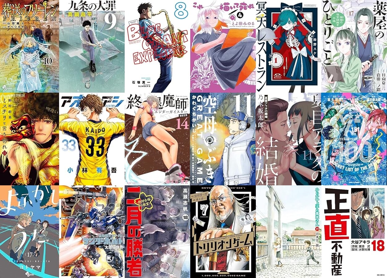 日本テレビでアニメ化!「葬送のフリーレン」に、真鍋昌平さん最新作「九条の大罪」、ドラマ放送された@ミステリと言う勿れ」、マンガ大賞2023で大賞に選ばれた「これ描いて死ね」、ほか「一勝千金」「BLUE GIANT EXPLORER」「名探偵コナン」「冥天レストラン」「よふかしのうた」「薬屋のひとりごと~猫猫の後宮謎解き手帳~」「アオアシ」「終の退魔師 ―エンダーガイスター―<無修正ver.>」「空母いぶきGREAT GAME」「夏目アラタの結婚」「ゾン100~ゾンビになるまでにしたい100のこと~」「機動戦士ガンダム サンダーボルト」「二月の勝者 ー絶対合格の教室ー」「血の轍」…など、管理人が独断と偏見で50冊ほどまとめました。