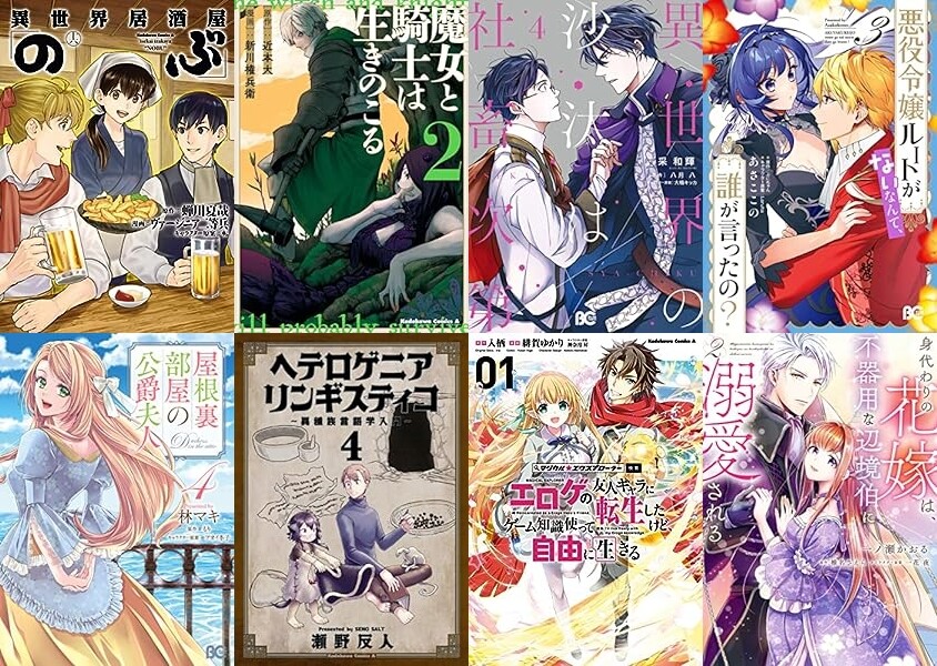 「異世界居酒屋『のぶ』」は1~16巻が50%OFF、そして一部の巻が45%ポイント還元、ほか「魔女と騎士は生きのこる」「異世界の沙汰は社畜次第」「悪役令嬢ルートがないなんて、誰が言ったの?」「屋根裏部屋の公爵夫人」「ヘテロゲニア リンギスティコ ~異種族言語学入門~」「マジカル★エクスプローラー」などなど。